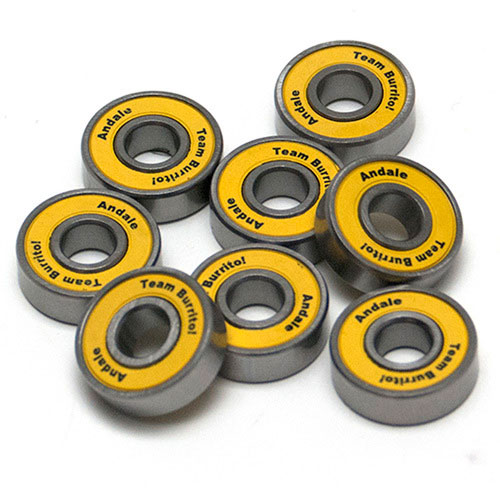 I Cuscinetti da Skateboard Andale Bearings ABEC 5 Yellow sono venduti in un Set di 8 Cuscinetti ABEC 5 e sono costituiti di Piste in acciaio di alta qualità e cuscinetti a sfera con finitura superficiale lucida di qualità superiore. La Protezione di gomma singola senza contatto permette una facile pulitura e minor frizione. Inoltre, Blocco sfere in nylon per una maggior forza e velocità. Questi cuscinetti sono stati Testati per Impatti Elevati.