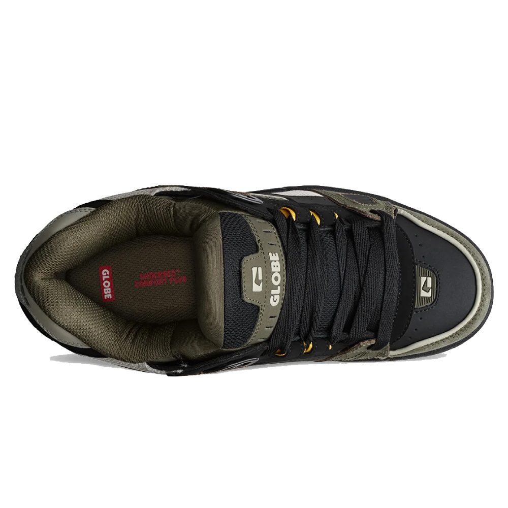 Le Scarpe da Skateboard Globe Sabre Black Army sono scarpe Stile skateboard ultra resistente con struttura a calzino per garantire comfort e stabilità . La Sabre nel colore Black/Gunmetal fa parte della nostra serie Heritage. È realizzata in Action Nubuck / Synthetic Nubuck e presenta una fodera a calzino Step-in con suola airbag Nitrocel™. È inoltre dotata del modello di suola S-Trac™ di Globe.