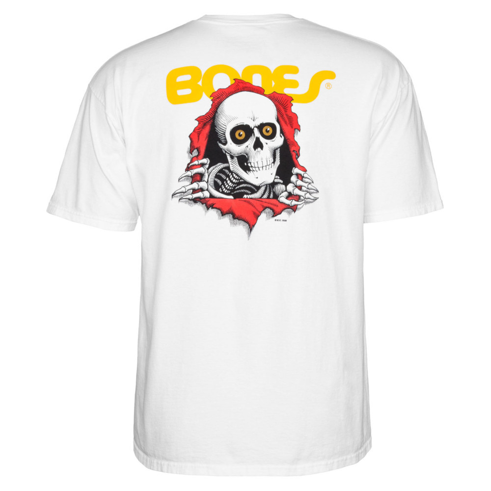 La T-shirt Powell Peralta Ripper White è una maglietta a maniche corte, girocollo in cotone, realizzata da Powell con stampa serigrafata con logo Ripper Bones Brigades grande sulla schiena e piccolo sul davanti.