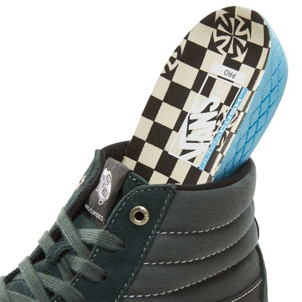 Le Scarpe Vans Sk8-Hi Pro Independent Spruce nascono dalla collaborazione Vans X Independent si ispira all'iconico logo a croce Independent e alla storia comune di Vans e dell'azienda di truck per skateboard numero uno al mondo.