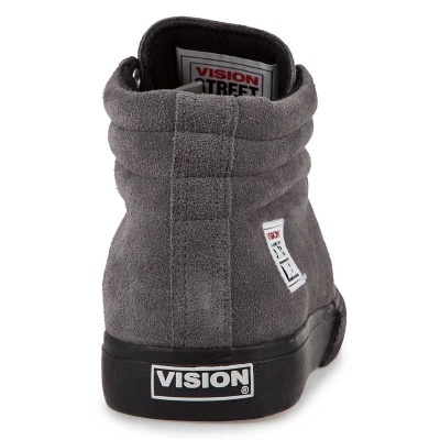 Le scarpe da uomo Vision Street Wear Suede Hi Charcoal-Black hanno la tomaia in camoscio con una dforma a silhouette hi-cut, la punta della scarpa è ricoperta di gomma, come lo è anche l'area Ollie. La suola esterna wrap cup sole è vulcanizzata con profilo Waffle, mentre la suoletta interna EVA è rimuovibile. Le asole lacci sono rifinite in metallo con colletto imbottito e buchi di ventilazione e lati perforati per migliorare la traspirazione. La fodera in pelle ha inserti tallone modellati e dettagli logo Vision Streetwear sulla linguetta, lati e suola della scarpa.