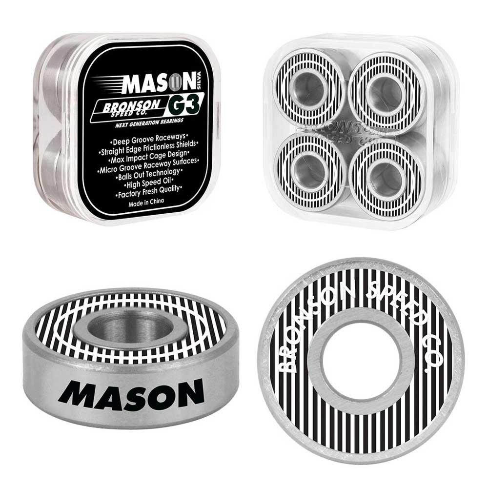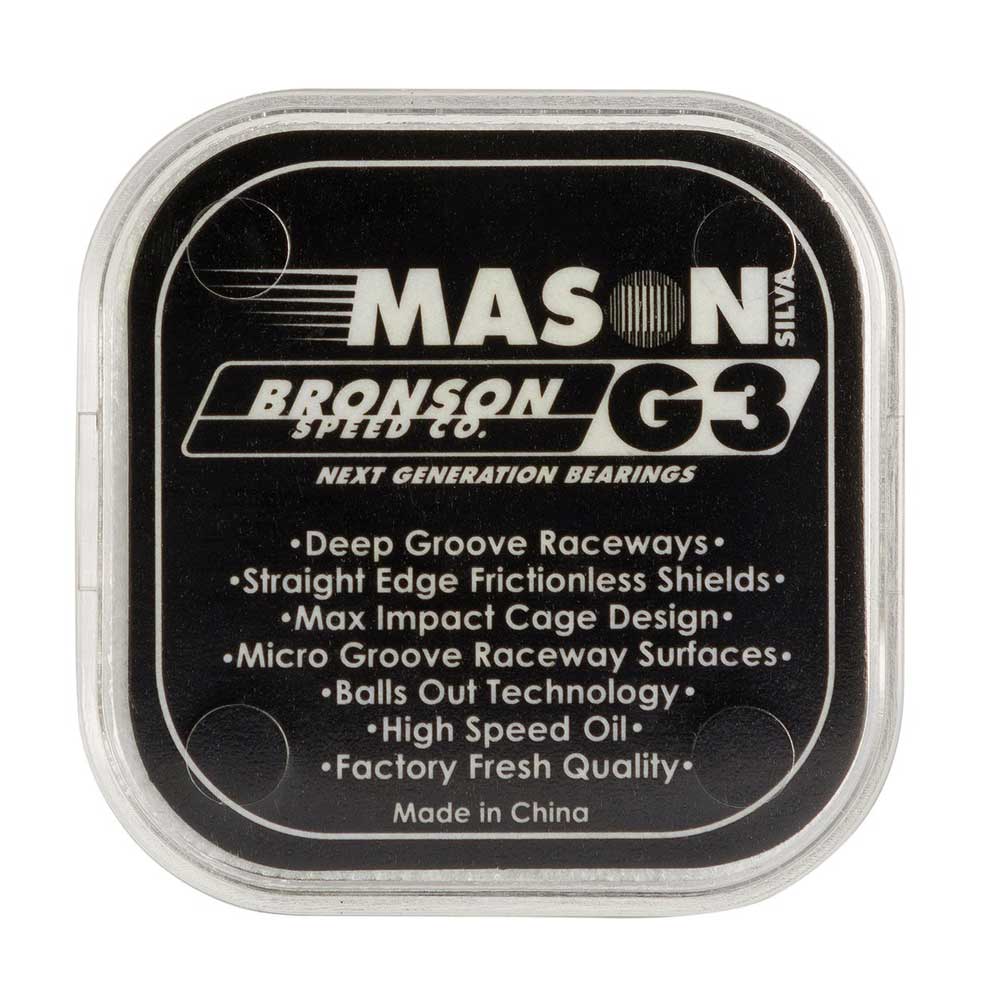 I Cuscinetti Bronson Speed Co G3 firmati Mason Silva Pro Bearing sono cusicnetti premium per performance massima con sistema Deep Groove Raceways, ovvero un canale disegnato specificamente per ridurre danni da impatti laterali e rotture Micro Groove Raceway Surfaces con una superfice interna ottimizzata del cuscinetto per maggior spin. Il Max Impact Cage Design offre una maggior precisione delle sfere e ottima circolazione di lubrificante. Inoltre la Balls Out Technology elimina contatto tra gabbia e protezione per maggior durabilità e velocitá. Sono pre-lubrificati con olio high speed nano ceramica, avendo più protezione contro corrosione e velocitá duratura. Infine, hanno una protezione rimovibile in gomma per meno frizione e pulitura facilitata.