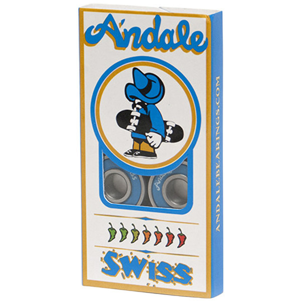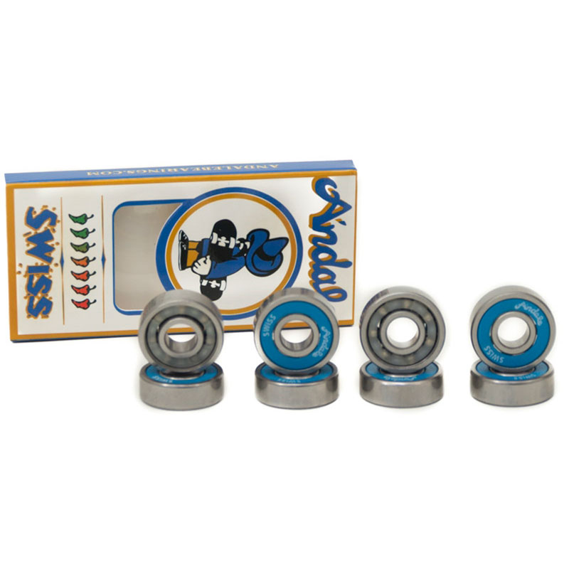 I Cuscinetti da Skateboard Andale Bearings Swiss Blue sono venduti in Set di 8 Cuscinetti Swiss di Andale e sono costituiti di Piste in acciaio di alta qualità e cuscinetti a sfera con finitura superficiale lucida di qualità superiore. La Protezione di gomma singola senza contatto permette una facile pulitura e minor frizione. Inoltre, il Blocco sfere in nylon permette una maggior forza e velocità. Questi cuscinetti sono stati Testati per Impatti Elevati.