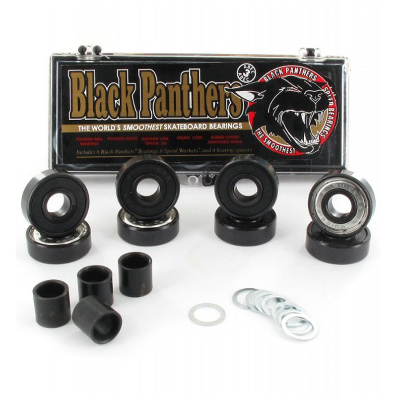 I Cuscinetti da Skateboard Shorty's Black Panthers Abec 3 sono anelli lucidi, lubrificati con olio al Teflon, pregiato nucleo in plastica Delrin, copertura protettiva in gomma, Speed Washer e con distanziatori abbinati sono tutti elementi che fanno dei Black Panthers uno tra i cuscinetti a sfera migliori al mondo.