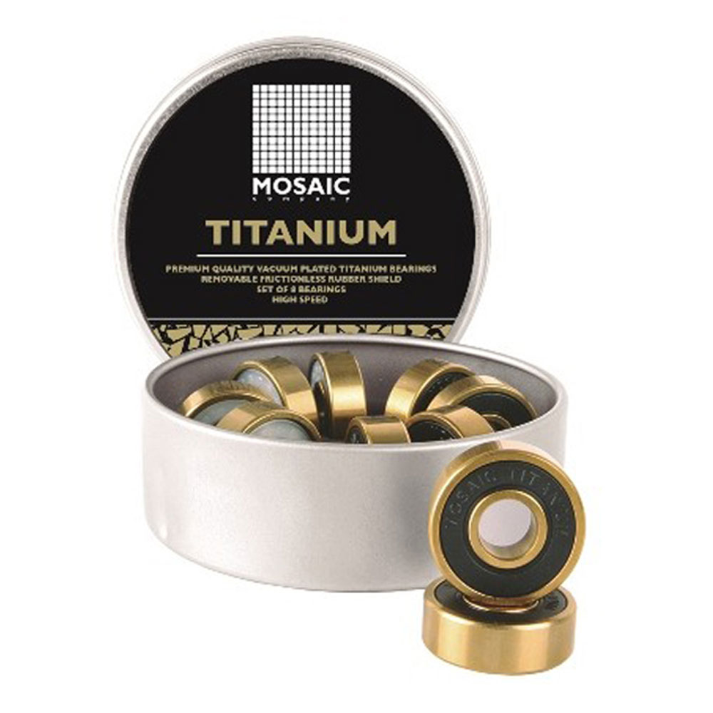 I Cuscinetti da Skate Mosaic Titanium Bearings Abec 7 sono perfetti per tutti gli sport su rotelle, oltre che per lo skateboard. Questi cuscinetti hanno una schermatura removibile in Titanio, che fa aumentare enormemente la resistenza alla corrosione, rivestito in gomma e sono stati pre-trattati con del lubrificante Mosaic Speed per raggiungere velocità elevatissime.