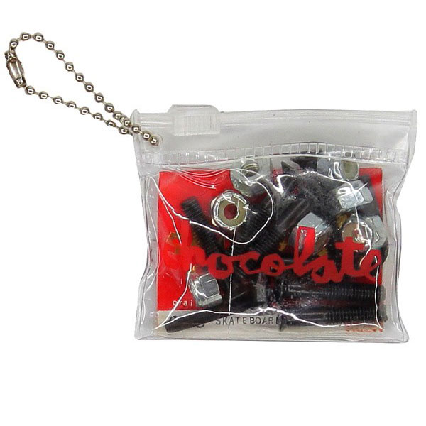 Il pack delle Chocolate Allen Hardware da 1'' sono composte da dadi e viti, 8 di ciascuno. Chiave a brugola inclusa. Sono contenute in un sacchetto di plastica trasparente con cerniera elegante con un allegato un portachiavi.