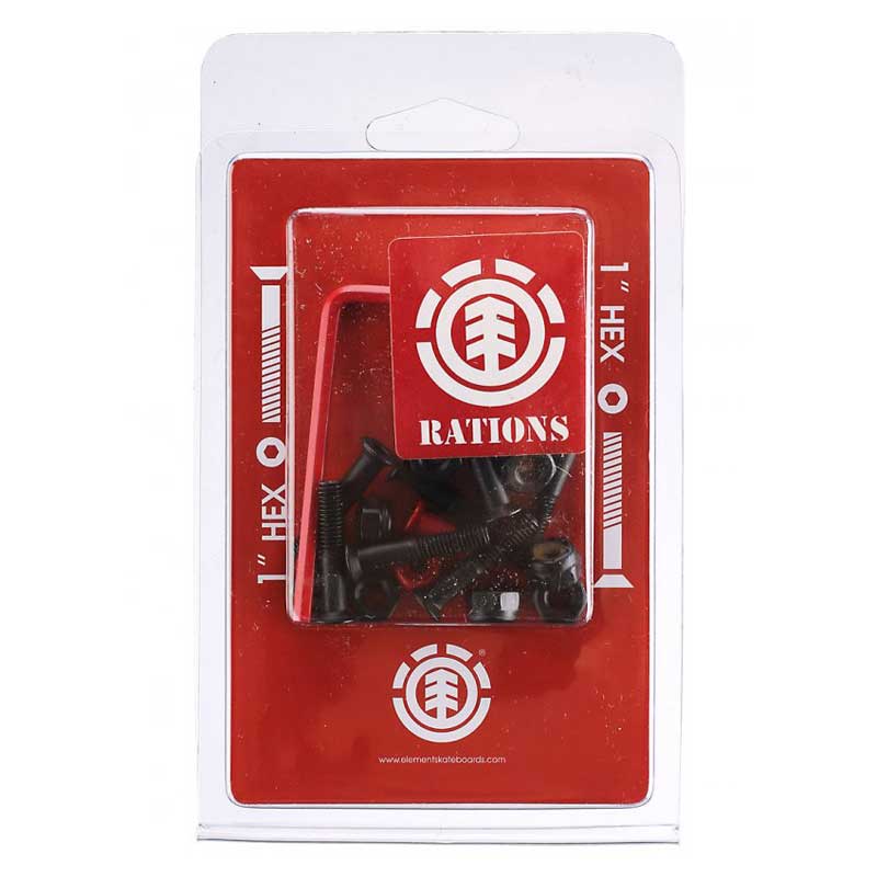 Gli Element Rations Hardaware Hex 1'' sono venduti in una confezione singola, contenente un set di 8 viti e bulloni esagonali con chiave a brugola e piccolo adesivo element. Questi Rations Hex da 1'' sono compatibili per il montaggio anche dei raiser pads.