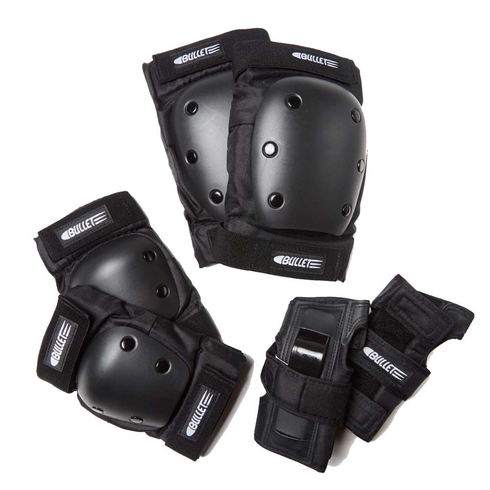 Il Set di Protezioni Bullet Black da Skate e Longboards comprende due ginocchiere, due gomitiere e due polsiere, per una protezione completa del corpo da urti e cadute da skate, longboard e pattini a rotelle. Questo tipo di protezioni sono consigliate per adulti e bambini.