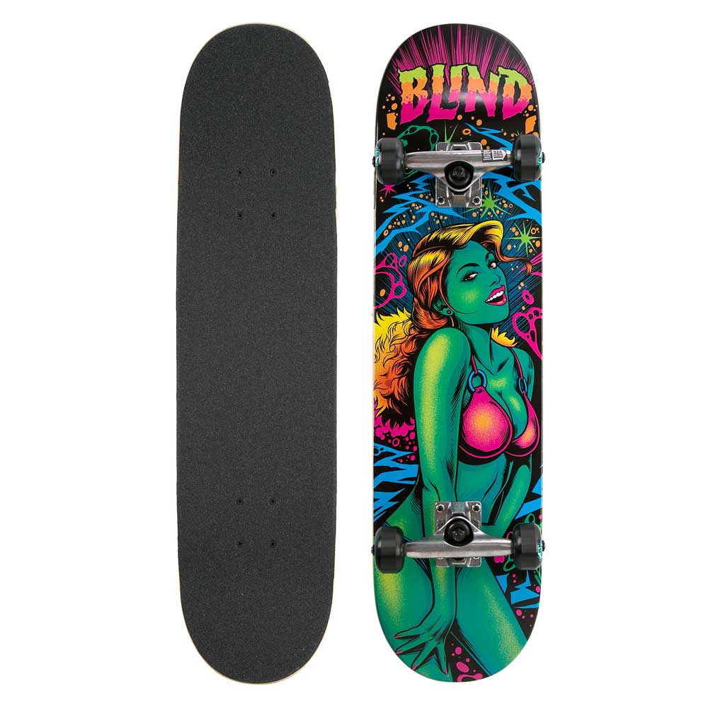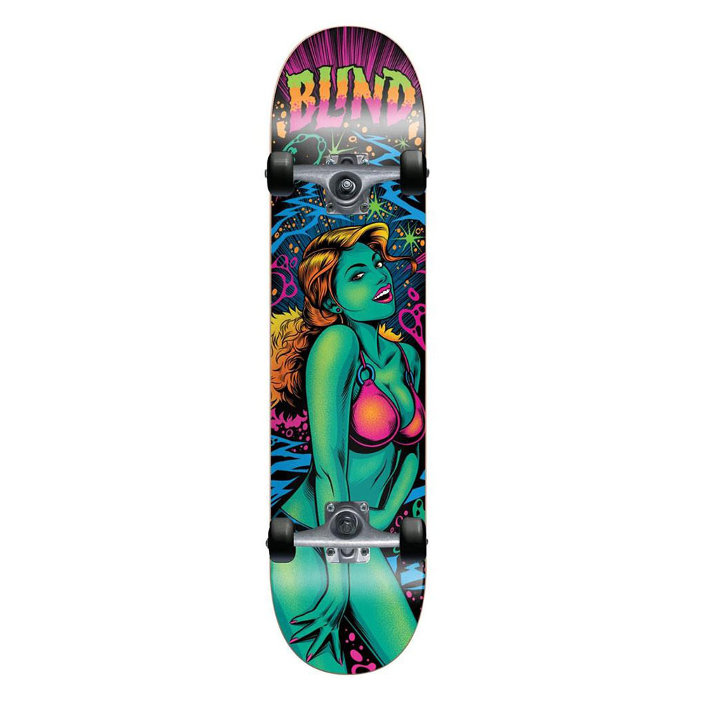 Lo Skateboard Completo Blind Blacklight Girl Teal 7.75'' è realizzato in legno a 7 strati di acero del nord america pressati ed incollati con resina epossidica. Truck Slant, ruote e cuscinetti Blind per uno skateboard altamente professionale !!!