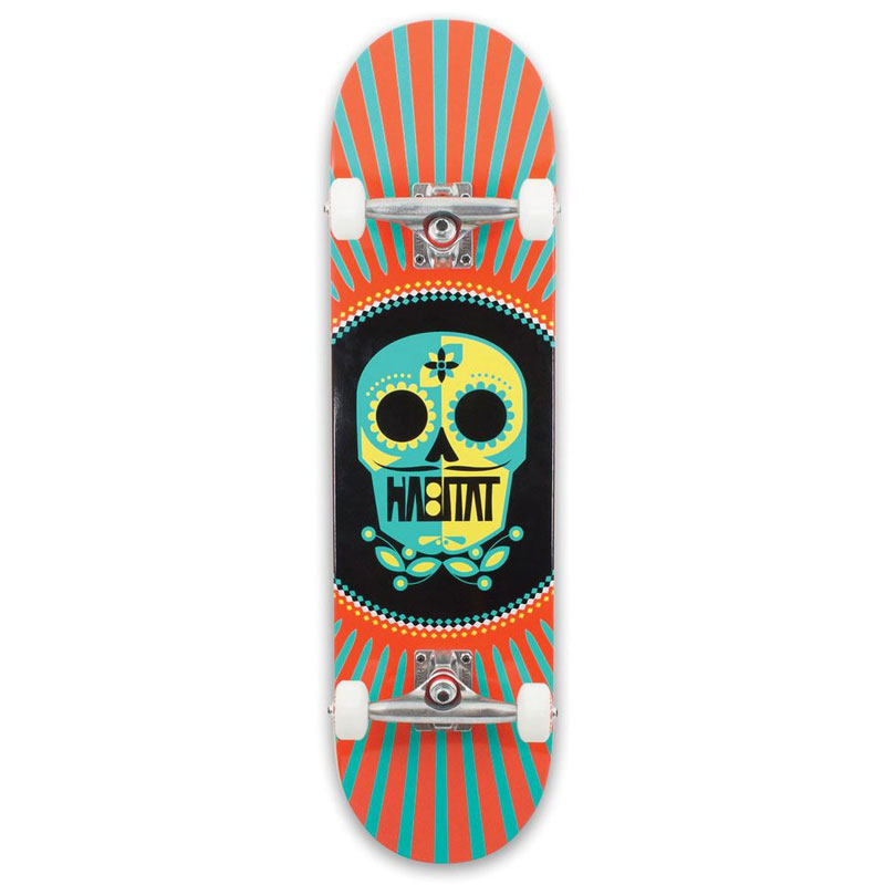 Lo Skateboard Completo Professionale Habitat Sugar Skull è uno skateboard preassemblato con accessori altamente professionali e tavola realizzata in acero del nord america a 7 strati incollati a pressione con colla epodossica.