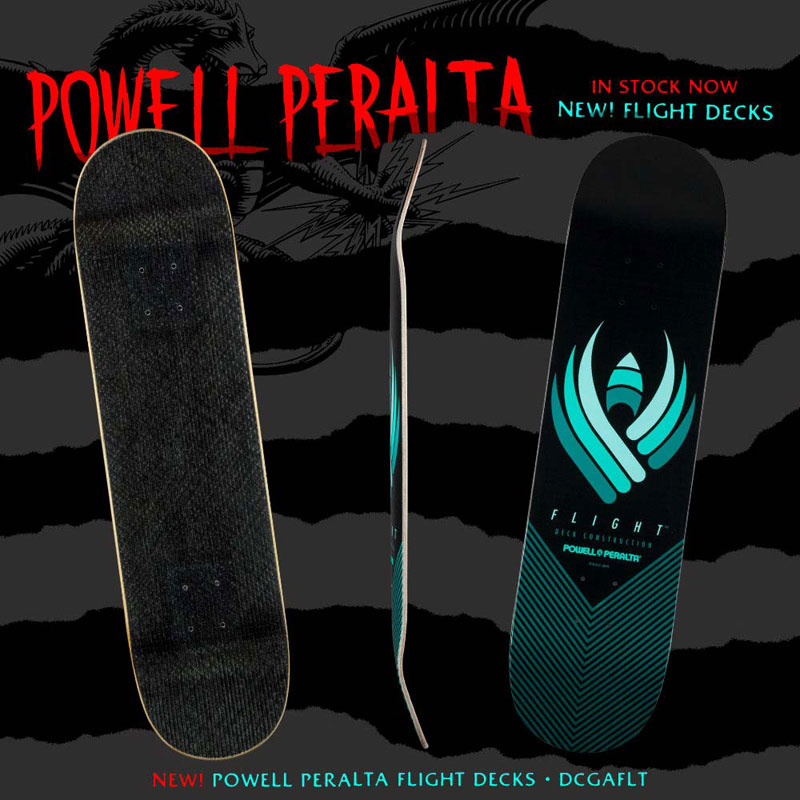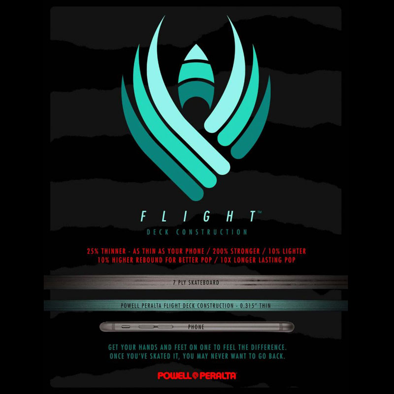 Le Tavole Powell Peralta Flight Construction sono costruite in una nuova zona di produzione al a Santa Barbara, in California. Queste tavole sono più forti, più sottili e più leggero di una classica 7-ply. Avrete la sensazione di poter fare le cose che non possono esser fatte su una tavola a 7-ply. Infatti, queste tavole consentono di estendere i propri limiti, perché consentono di fare ollie più alti, ruotare più velocemente la tavola, fare tricks con facilità e non si rompono in due come una 7-ply.
