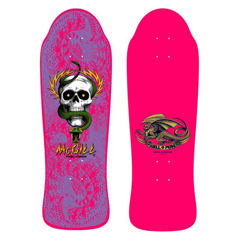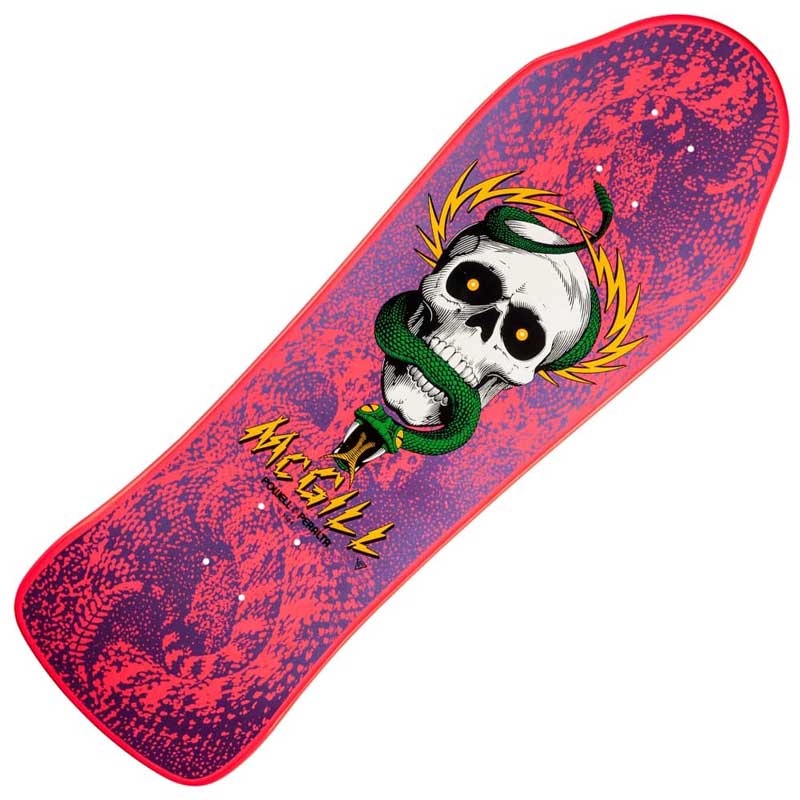 Le Tavole da Skateboard Old School Mc Gill Skull & Snake sono disponibili nelle misure 9.94'' x 30,43'' per quella Pink e in 11'' x 30,125'' per quella viola e sono una Edizione Limitata Bones Brigade.