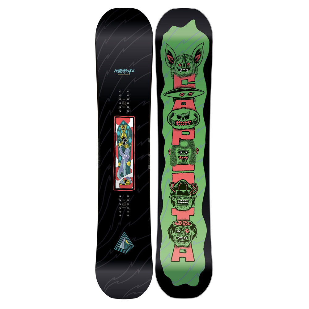 La Horroscope, una tavola che ti fa passare la paura in un istante. Uno dei migliori modelli urban e park sul mercato, divertente, perfettamente manovrabile e facile all’utilizzo, realizzato grazie all’integrazione della resina Magic Bean e di speciali fibre di vetro che ne aumentano la resistenza e la durata nel tempo. Presenta un nuovo profilo Park V2 ed è costruita con la nuova Superdrive EX Base, per una robustezza assoluta anche dopo le più forti sollecitazioni. Più volte vincitrice dei Transworld Snowboarding Top Ten Good Wood, la Horroscope è caratterizzata da una forma smussata con tail e nose più corti, zero camber al centro e reverse camber perfetta per il jibbing e il park, che consentono un miglior controllo della tavola in ogni situazione, senza perderne in performance. Disegnata e testata dal team per essere leggera, duratura e più cool di quanto si possa immaginare. Da sempre prima nelle classifiche di vendita del marchio CAPiTA, ulteriormente migliorata per il 2019 con l’inserimento della resistentissima base Superdrive è la tavola che offre il celebrato spirito freestyle CAPiTA alla portata di tutti.