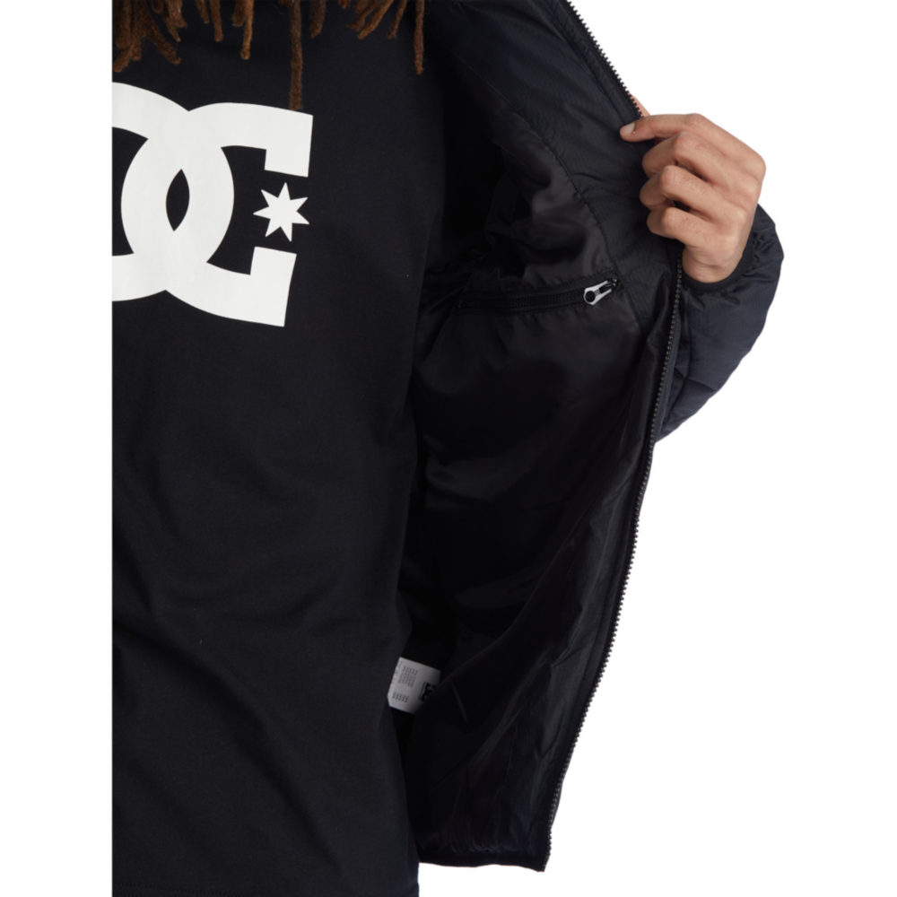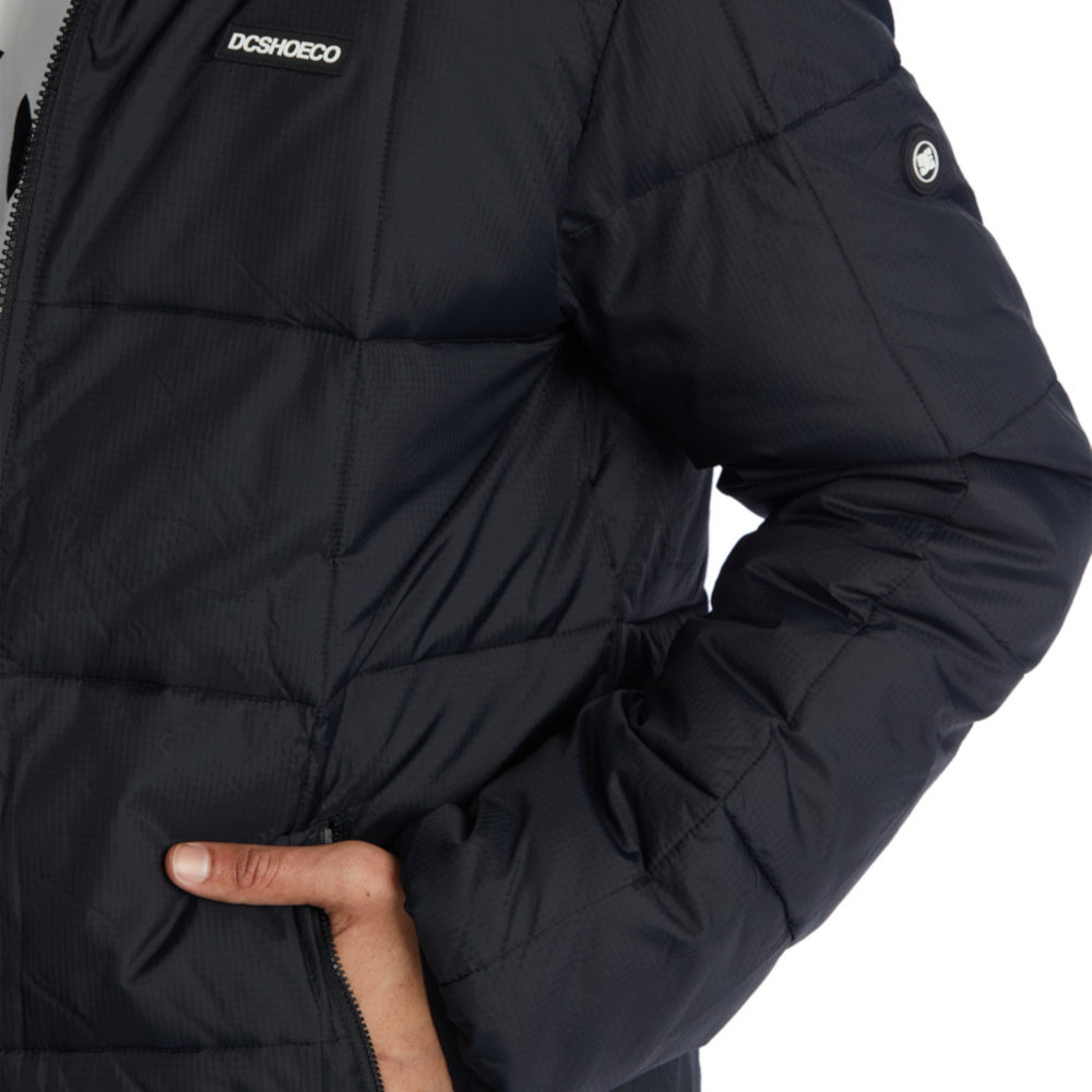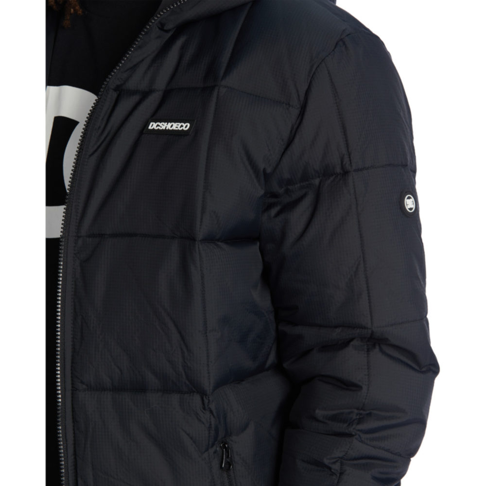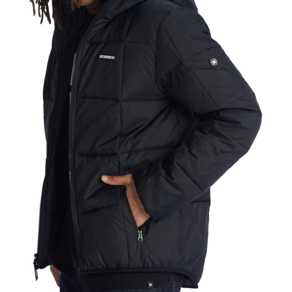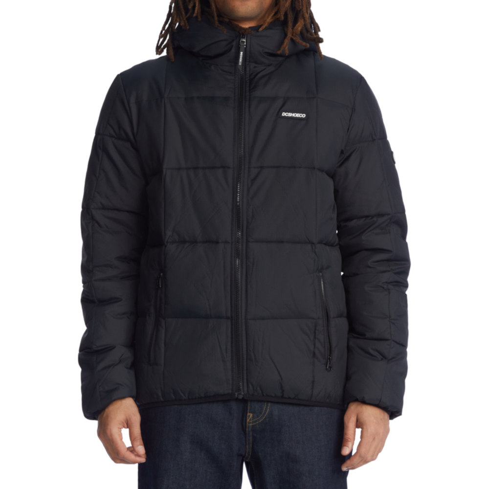 La Giacca DC Shoes Square Up Puffer 2 Black è una Giacca imbottita trapuntata da Uomo con cappuccio fisso a 3 pannelli, fodera in taffetà di poliestere con imbottitura da 280 g in finta piuma e tasche per le mani con cerniera a vista.