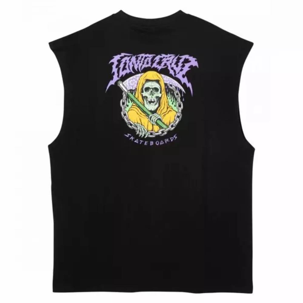 La Canotta Santa Cruz Out Of Time Tank Black è uno Smanicato da Uomo in jersey 100% cotone biologico, 180 g/m², vestibilità regolare con stampa al centro sul petto e stampa grande sul retro.