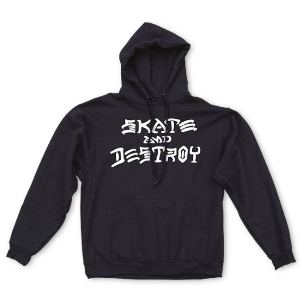 La Felpa Thrasher Skate and Destroy Hood Black è una felpa nera con cappuccio di Thrasher, stampa frontale stampata e tasca centrale.