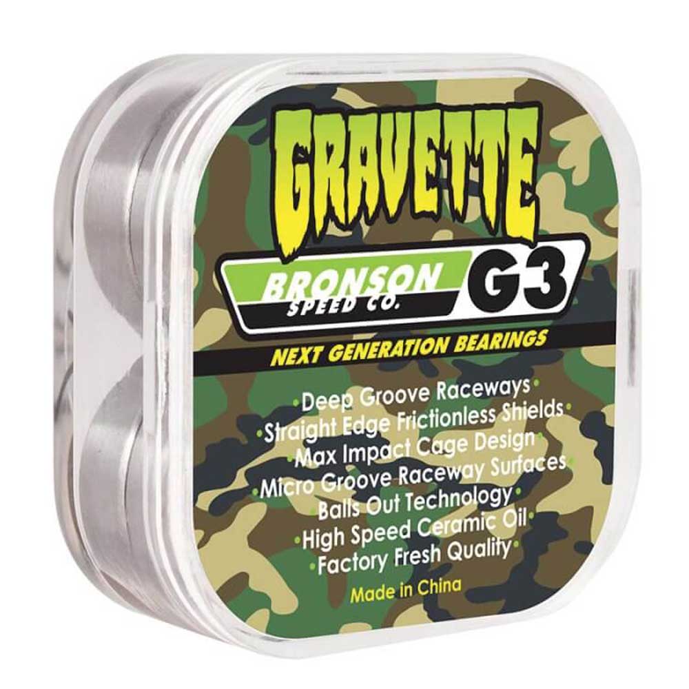 I Cuscinetti Bronson Speed Co G3 firmati David Gravette Pro Bearing sono cusicnetti premium per performance massima con sistema Deep Groove Raceways, ovvero un canale disegnato specificamente per ridurre danni da impatti laterali e rotture Micro Groove Raceway Surfaces con una superfice interna ottimizzata del cuscinetto per maggior spin. Il Max Impact Cage Design offre una maggior precisione delle sfere e ottima circolazione di lubrificante. Inoltre la Balls Out Technology elimina contatto tra gabbia e protezione per maggior durabilità e velocitá. Sono pre-lubrificati con olio high speed nano ceramica, avendo più protezione contro corrosione e velocitá duratura. Infine, hanno una protezione rimovibile in gomma per meno frizione e pulitura facilitata.